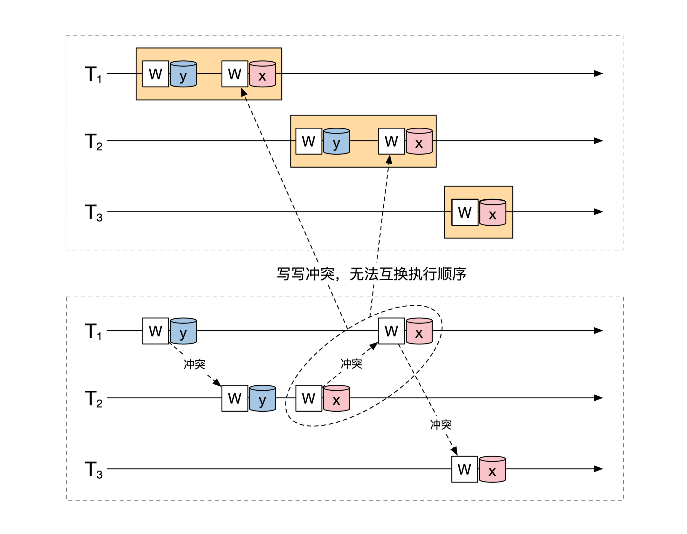 但是你无法通过无冲突互换的过程,将这3个事务的执行顺序变为串行化的结果。原因是中间两个对 x 的写操作导致 T1 和 T2 无法调整为串行执行,就像下面这幅图解释的一样: