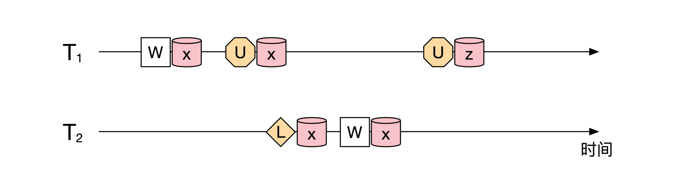 有很多人会对这些资源做读或者写的操作。每个人的操作叫作事务,我们用 T来表示。所以一个事务T里会有一系列读写操作。下面是一个时序图,展示了两个事务随着时间推移的情况:
