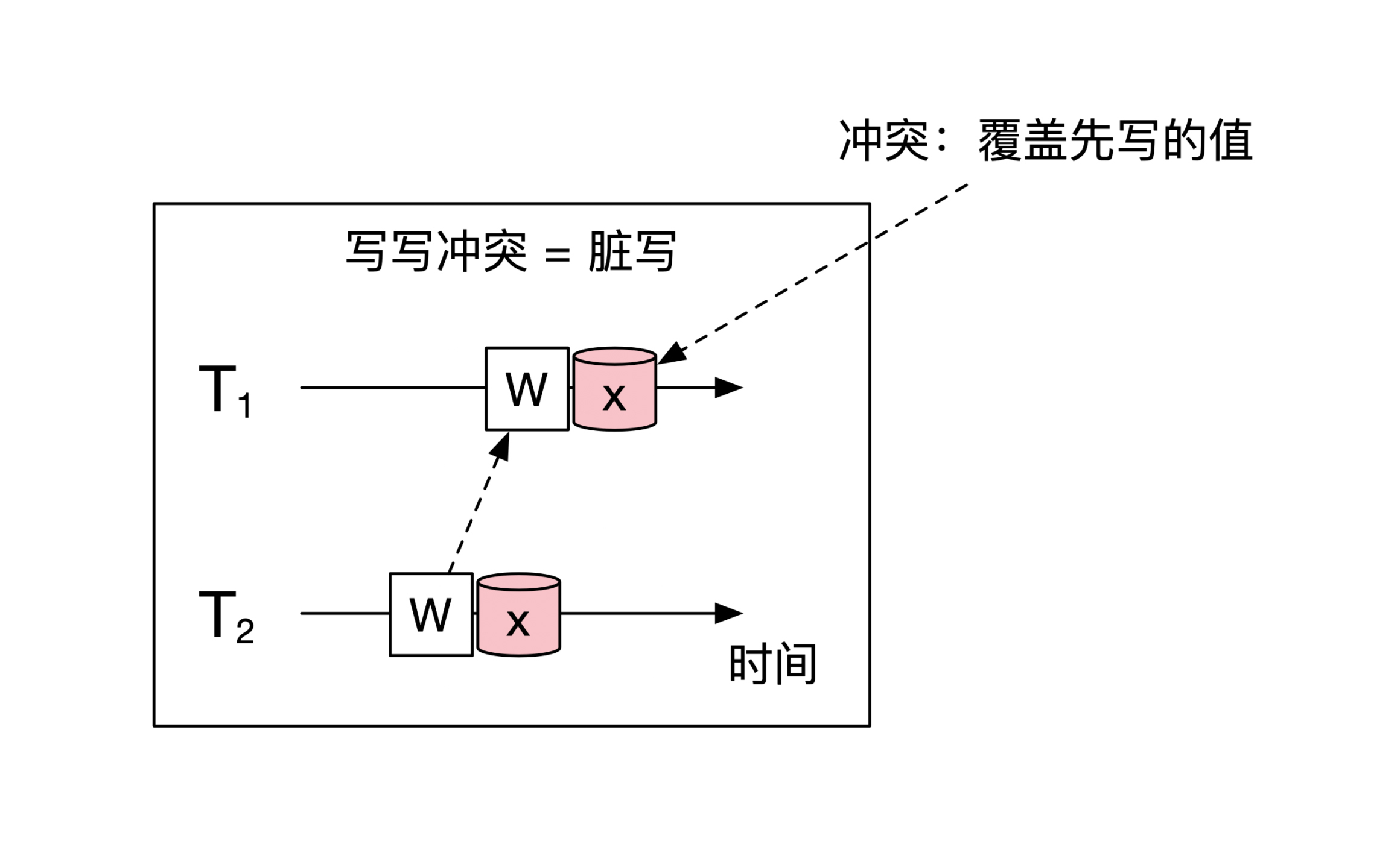 最低的隔离级别 Read Uncommitted 解决了脏写(Dirty Write)的问题。脏写指的是两个事务写了同一份资源,这样后写的事务会覆盖先写的内容。其实脏写就是上面提到的写写冲突,示意图如下: