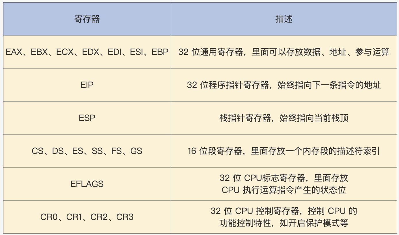 保护模式相比于实模式,增加了一些控制寄存器和段寄存器,扩展通用寄存器的位宽,所有的通用寄存器都是32位的,还可以单独使用低16位,这个低16位又可以拆分成两个8位寄存器,如下表。