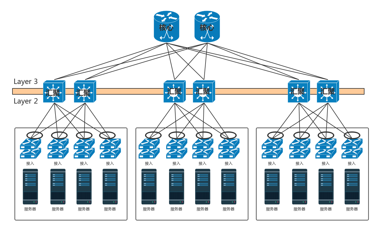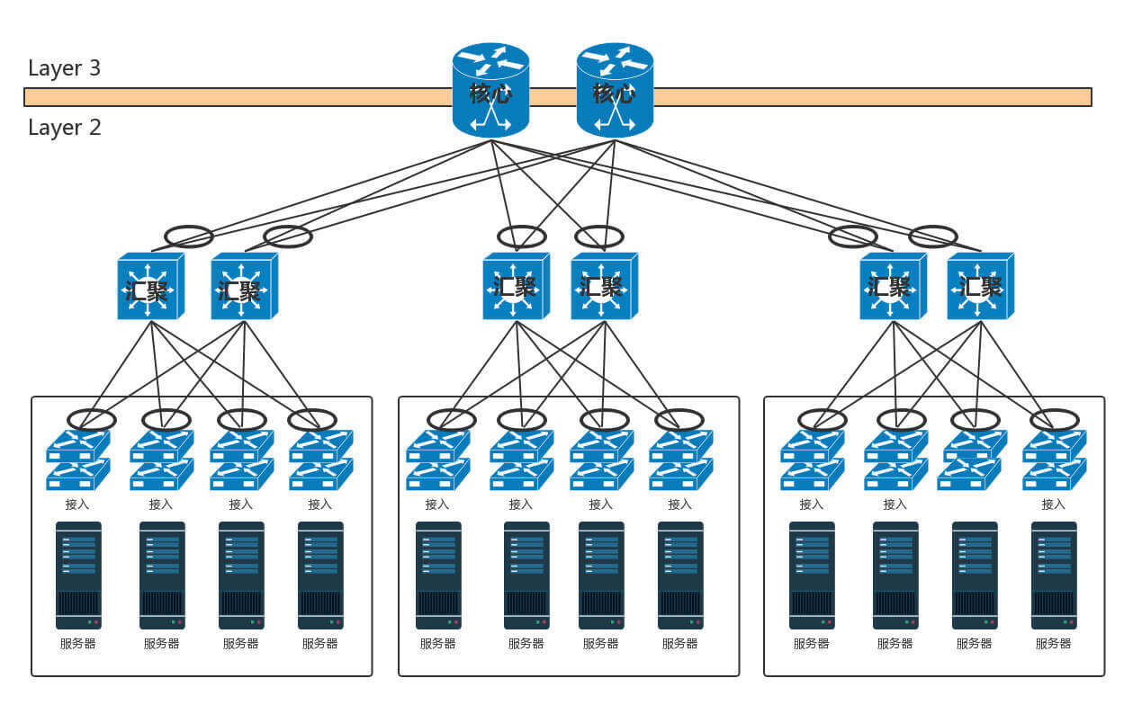 - 数据中心分为三层。服务器连接到接入层,然后是汇聚层,再然后是核心层,最外面是边界路由器和安全设备。