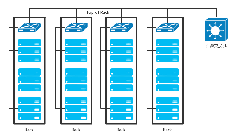 当一个机架放不下的时候,就需要多个机架,还需要有交换机将多个机架连接在一起。这些交换机对性能的要求更高,带宽也更大。这些交换机称为汇聚层交换机(Aggregation Layer)。