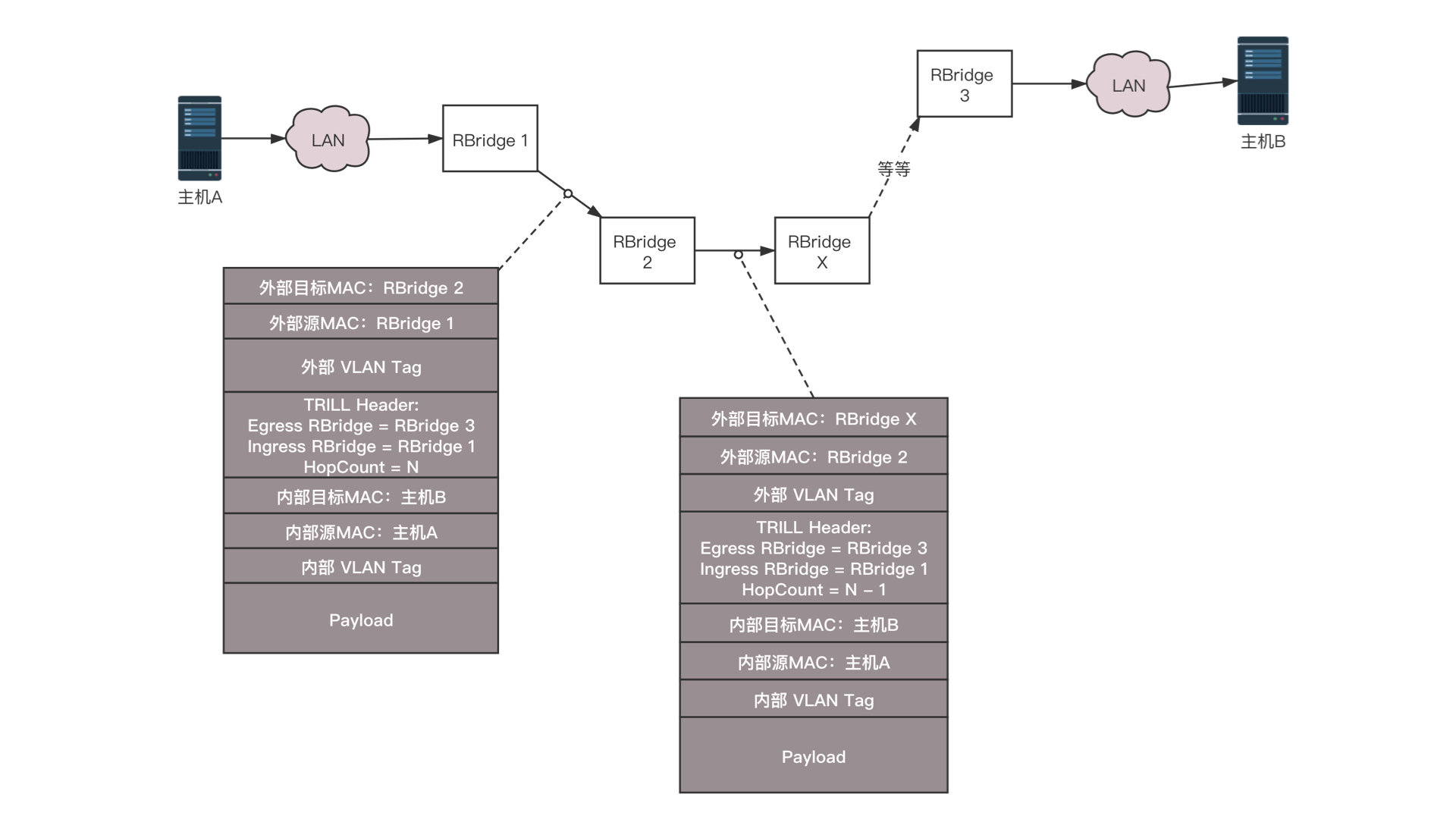 如图中所示的过程,有一个包要从主机A发送到主机B,中间要经过RBridge 1、RBridge 2、RBridge X等等,直到RBridge 3。在RBridge 2收到的包里面,分内外两层,内层就是传统的主机A和主机B的MAC地址以及内层的VLAN。