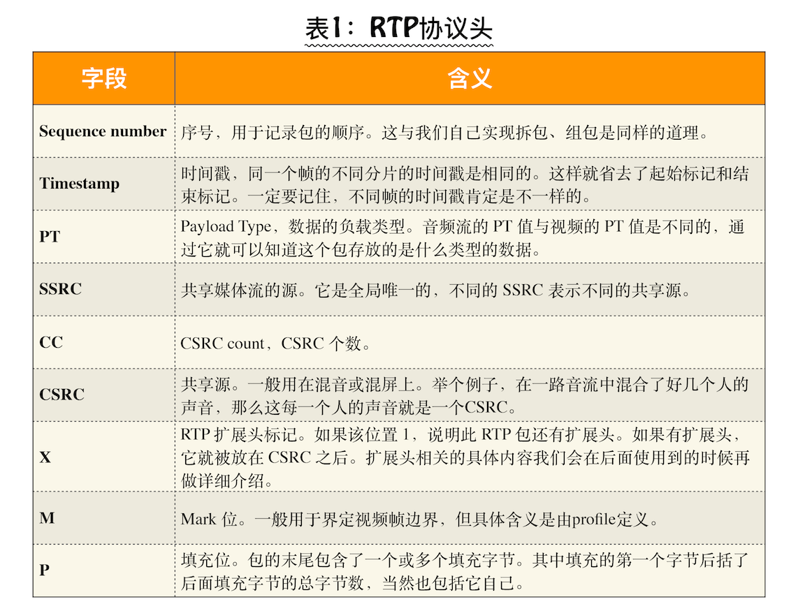 这里,我并没有将RTP协议头中的所有字段的详细说明都列在这儿,如果你想了解所有字段的含义,可以到参考一节查看其他字段的含义。需要注意的是,这里没有将它们列出来并不代表它们不重要。恰恰相反,如果你想做音视频传输相关的工作,RTP头中的每个字段的含义你都必须全部清楚。