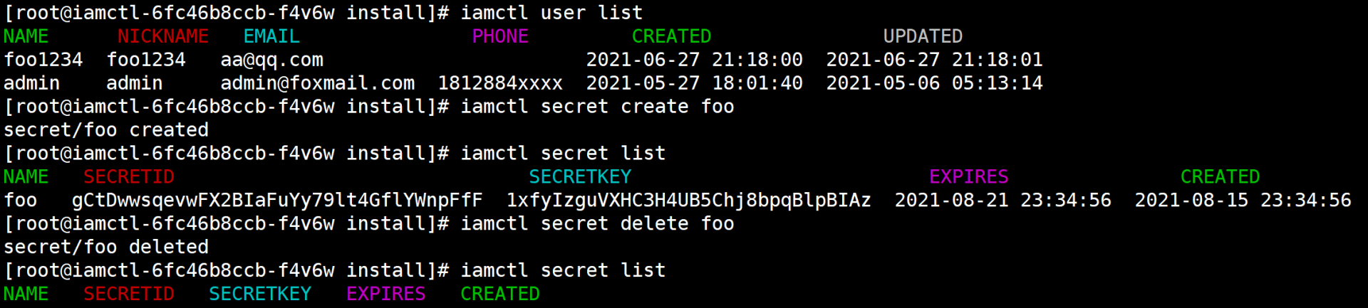 应用部署起来之后,我们可以登陆到 iamctl-xxxxxxxxxx-xxxxxPod,并执行以下命令来测试整个IAM应用是否被成功部署:
