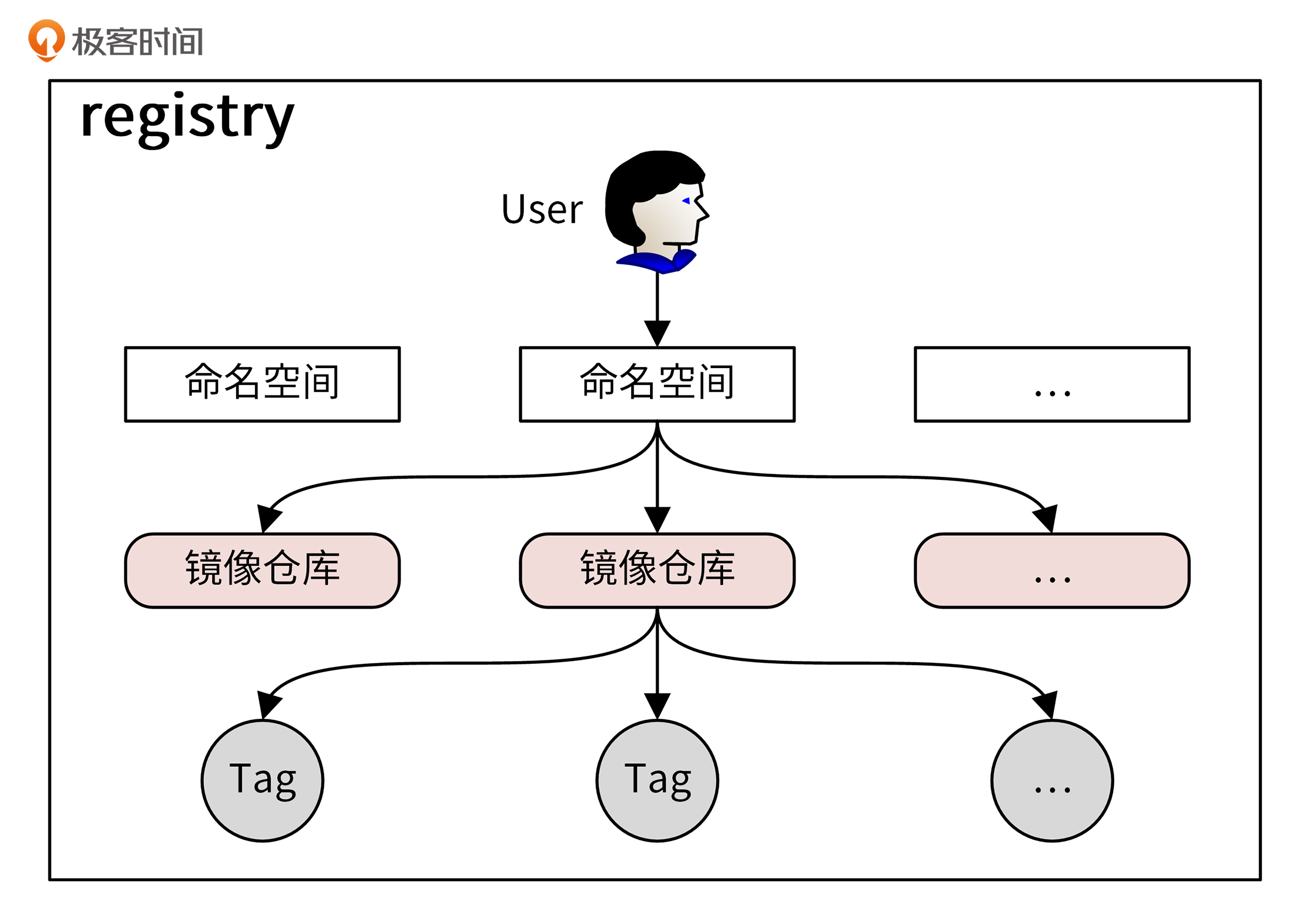 这里,镜像仓库服务、命名空间、镜像仓库、标签这几个概念你可能弄不清楚。接下来,我详细介绍下四者的关系,关系如下图所示: