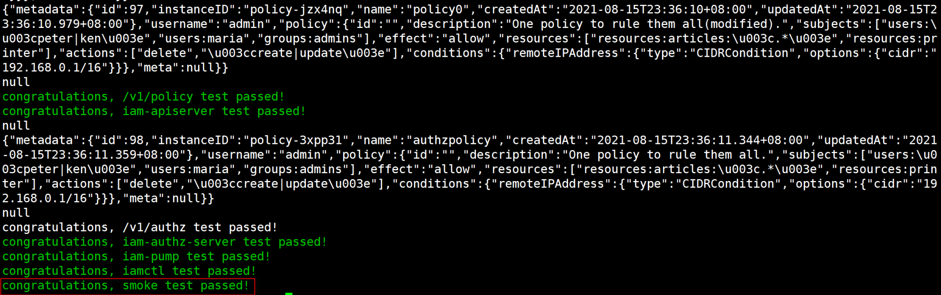 如果./test.sh iam::test::smoke命令,打印的输出中,最后一行为congratulations, smoke test passed!字符串,说明IAM应用安装成功。如下图所示: