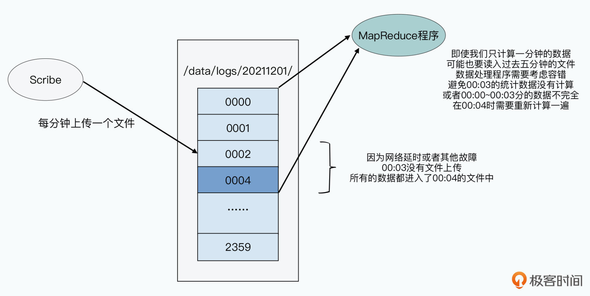 可是光这样还不够,因为Scribe里,也可能会出现网络中断、硬件故障等等的问题,所以我们很有可能,在运行MapReduce任务去分析数据的时候,Scribe还没有把文件放到HDFS上。那么,我们的MapReduce分析程序,就需要对这种情况进行容错,比如,下一分钟的时候,它需要去读取最近5分钟的数据,看看Scribe上传的新文件里,是否会有本该在上一分钟里读到的数据。