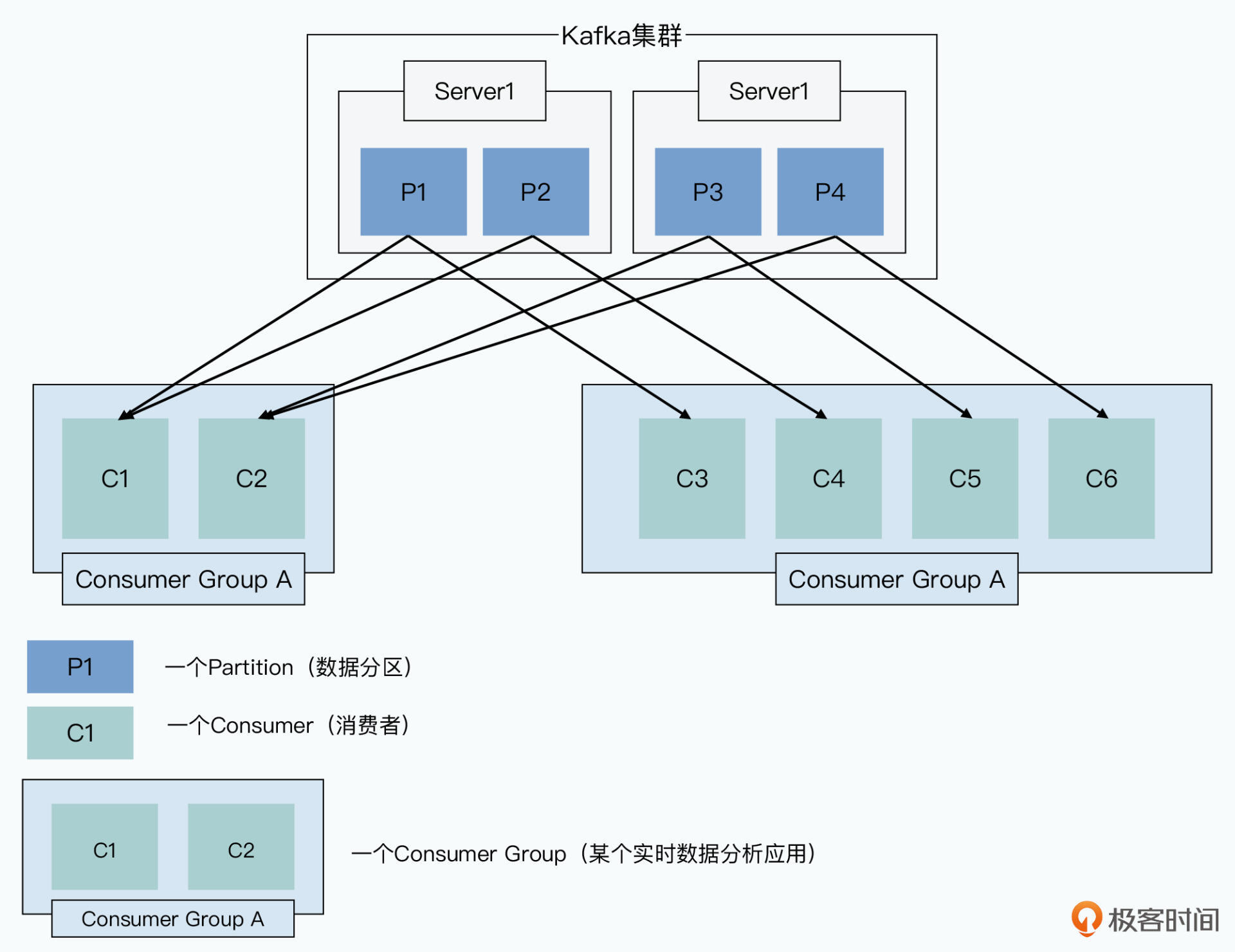 然后,基于这两个设计思路,Kafka做了一些简单的限制,那就是一个consumer总是顺序地去消费,来自一个特定分区(Partition)的消息。而一个Partition则是Kafka里面可以并行处理的最小单位,这就是说,一个Partition的数据,只会被一个consumer处理。