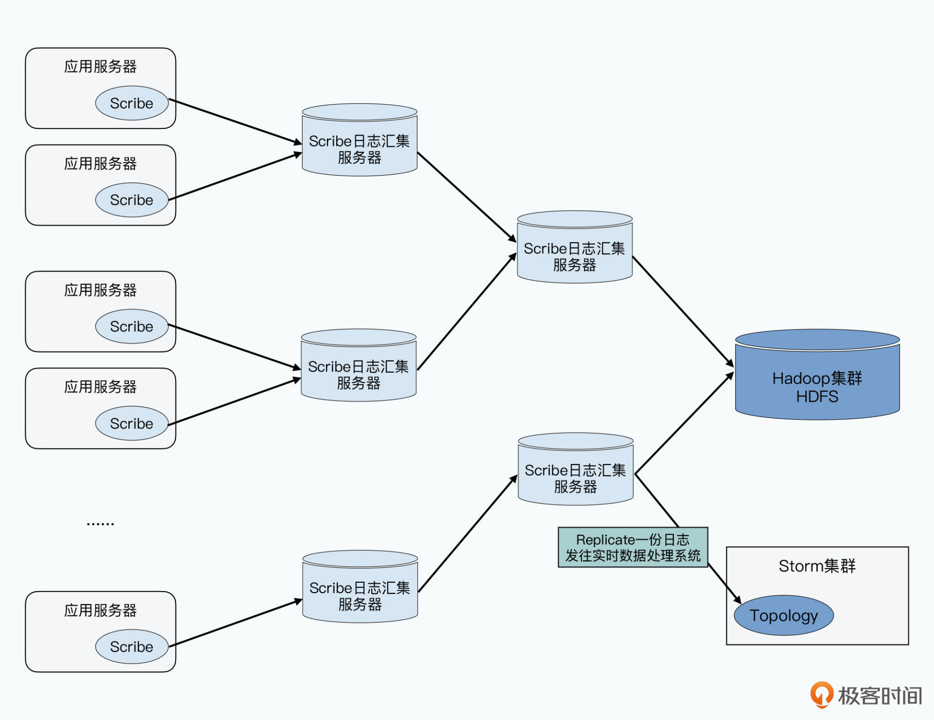 而像Scribe这样的日志收集系统,考虑的是能否高吞吐量地去传输日志,至于下游如何处理日志,它是不关心的。