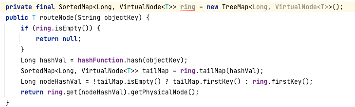 TreeMap的TailMap是返回大于等于key的子树,然后调用子树的firstKey获取TreeMap中最小的元素,符合一致性哈希算法的命中规则。又因为TreeMap是一棵排序树,所以得到最小、最大值会非常容易。
