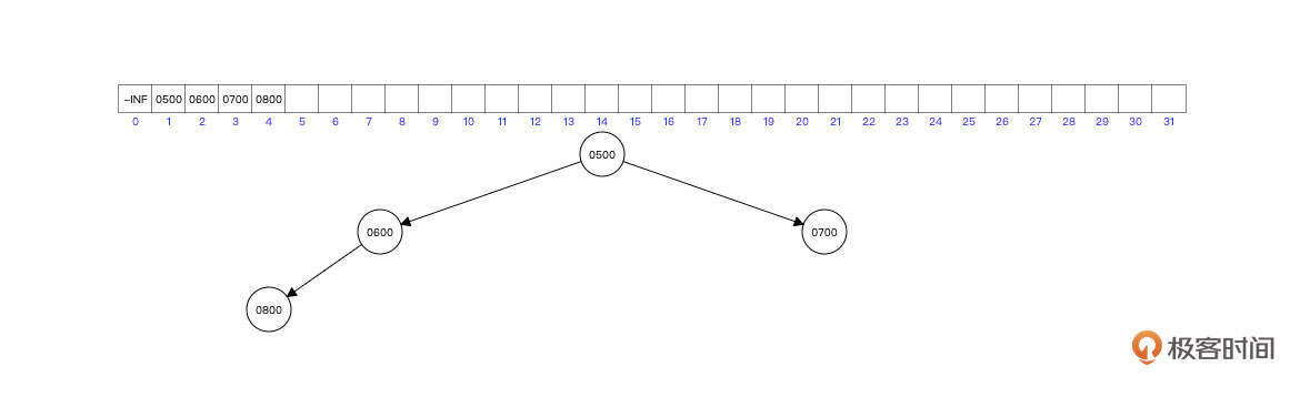 首先我们连续插入节点 500,600,700,800,其内部结构如下图所示: