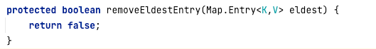 可以看到,默认返回的是false,表示LinkedHashMap并不会启用节点的淘汰机制。为了实现LRU算法,我们需要继承LinkedHashMap并重写该方法,具体实现代码如下: