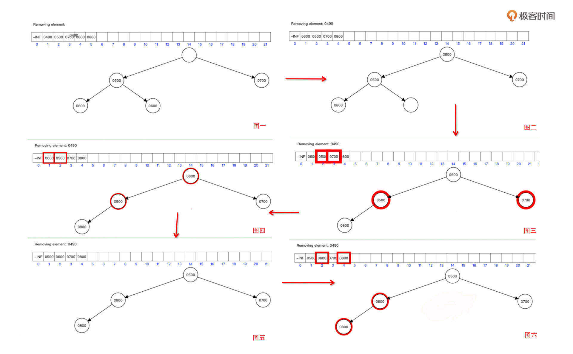 构建好堆之后,我们再来看看怎么从堆中获取数据。要注意的是,访问数据只能从堆的根节点开发方法,具体做法就是删除根节点,并将根节点的值返回。我们先尝试删除根节点490: