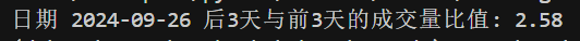 根据结果可以看到 9 月 26、27、30这三天的成交量是 25、24、23 这三天成交量的 2.58 倍,说明是放大的。