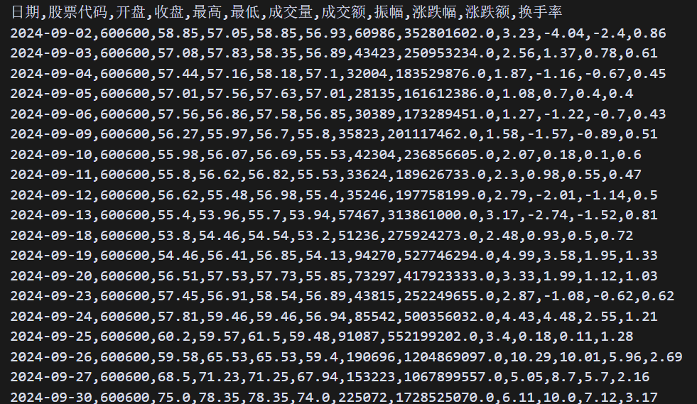 首先,我们需要使用 AKShare 抓取青岛啤酒 2024-09-01 ~ 2024-09-30 这一个月的历史行情数据。这在第 29 节课进行过相关技术的讲解,这里我就不重复。抓取到的数据如下:
