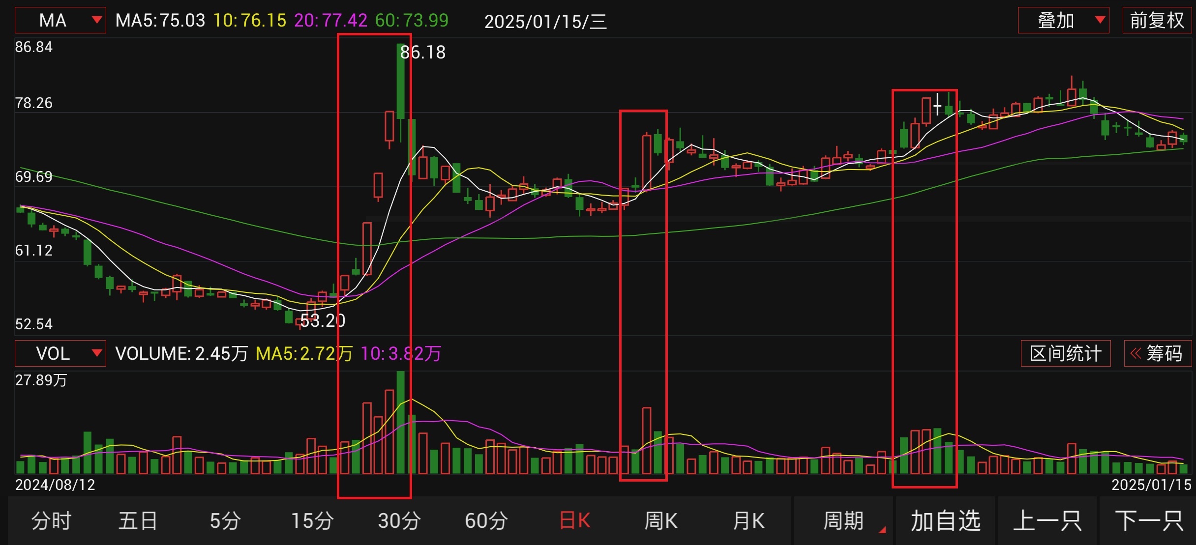 我在图中,用三个红框圈出了三个时间周期。可以看到在这三个周期内,股价都有所上涨,并且下方的成交量相比上涨前,都有明显的增加,这便是量增价涨。