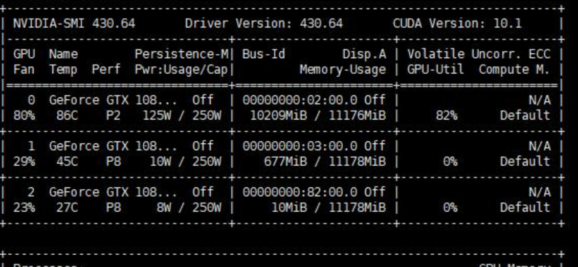 我们可以使用nvidia-smi命令查看GPU使用情况。如果你足够细心就会发现,使用多个卡做训练的时候,output_device的卡所占的显存明显大一些。