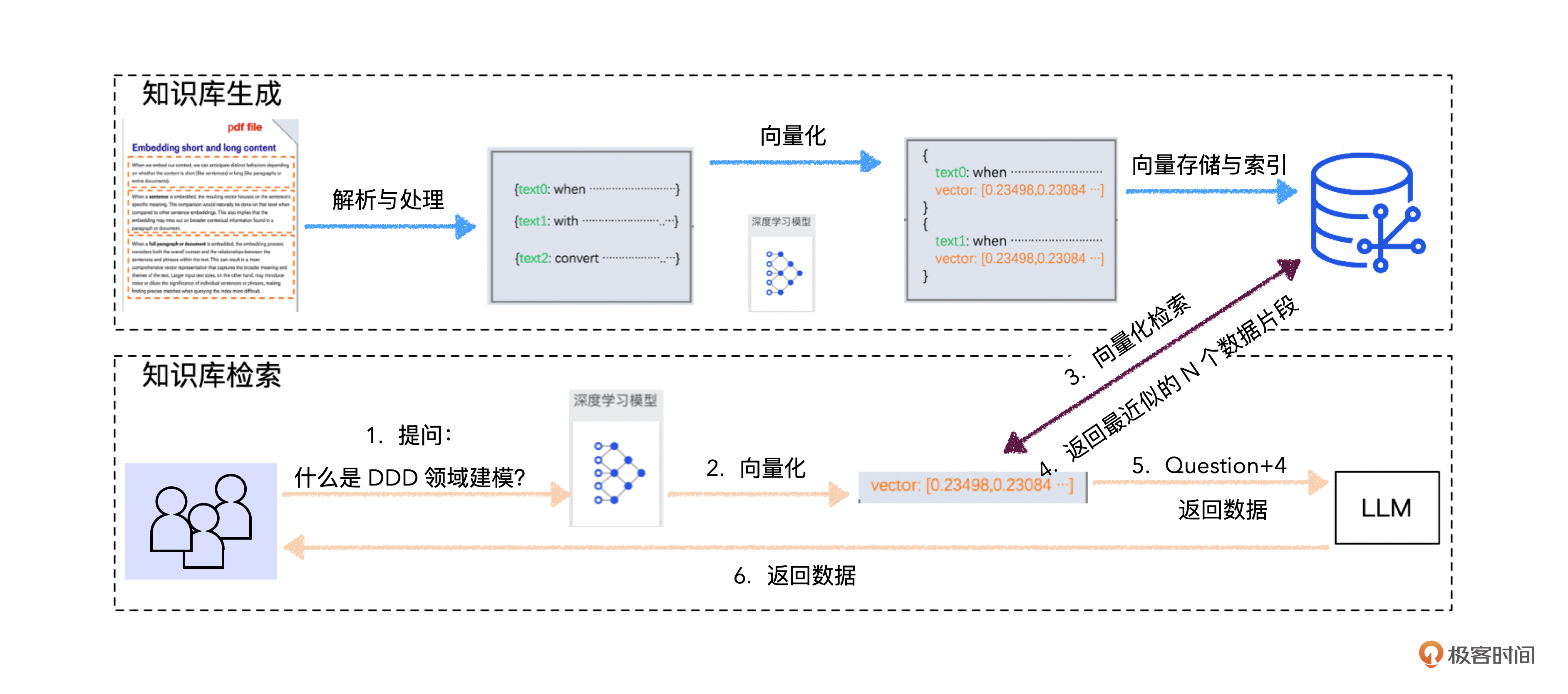 虽然图上的内容不少,但大致来看,搭建、使用基于RAG的知识库一共有4步。