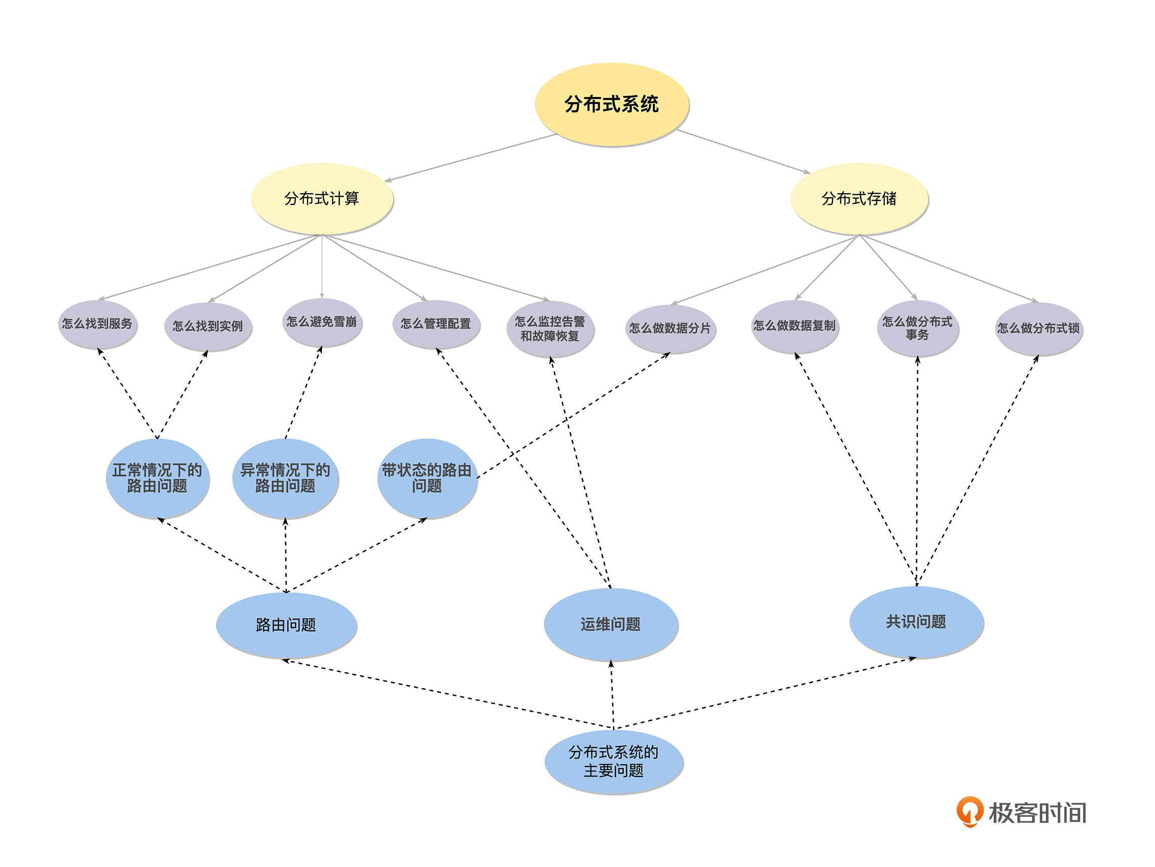 所以,在这个专栏中,我会以分布式系统的前因后果为脉络,打造一条由浅入深、从简单到复杂的学习路径,并且会从路由问题、共识问题和运维问题这三大角度,对分布式系统的知识点进行交叉串讲。当你按照这条线性的路径完成学习后,将会得到一个网状的知识体系。