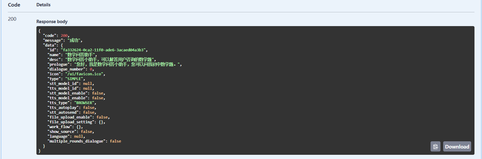 我们顺便将对话 API 也测试了,这样能摸清楚它的返回值的格式。