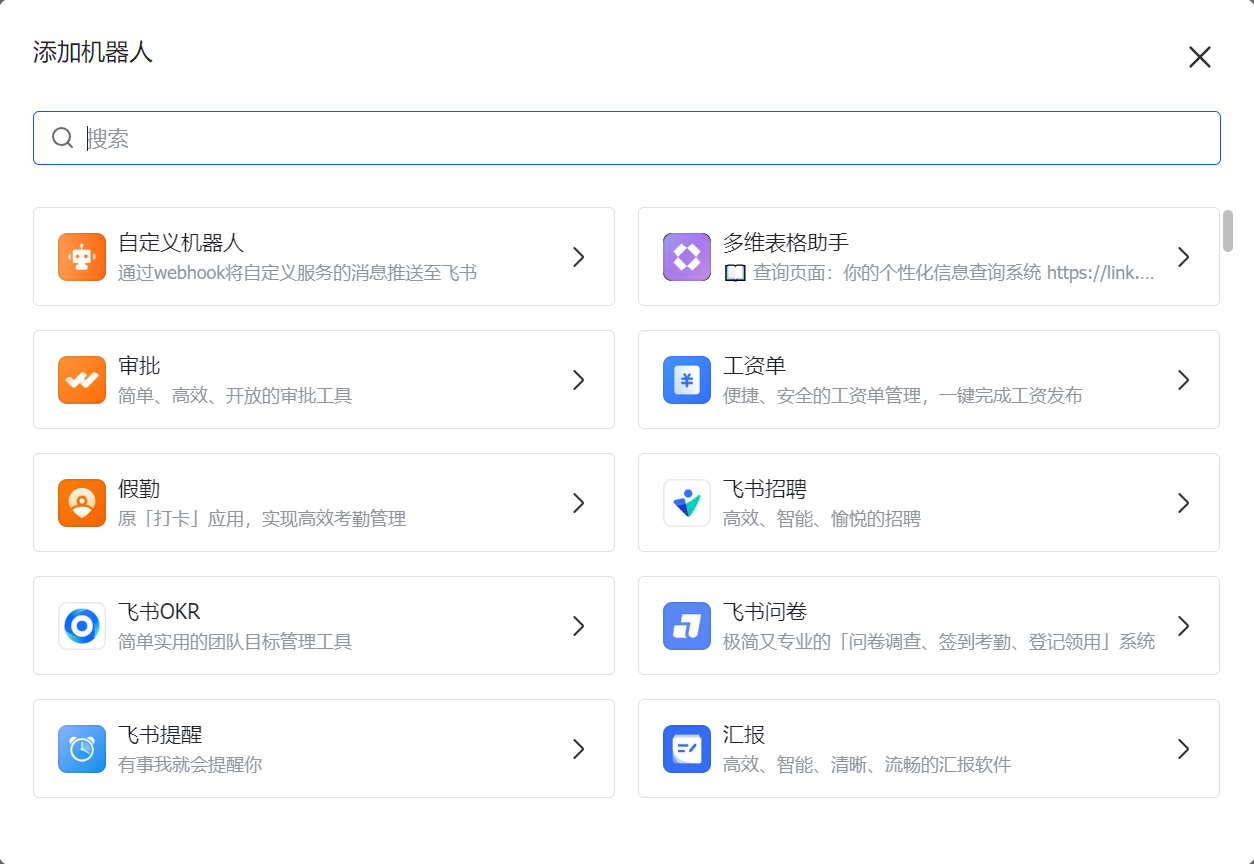 首先在飞书上建一个群,然后选择群机器人,选择自定义机器人,进行添加。