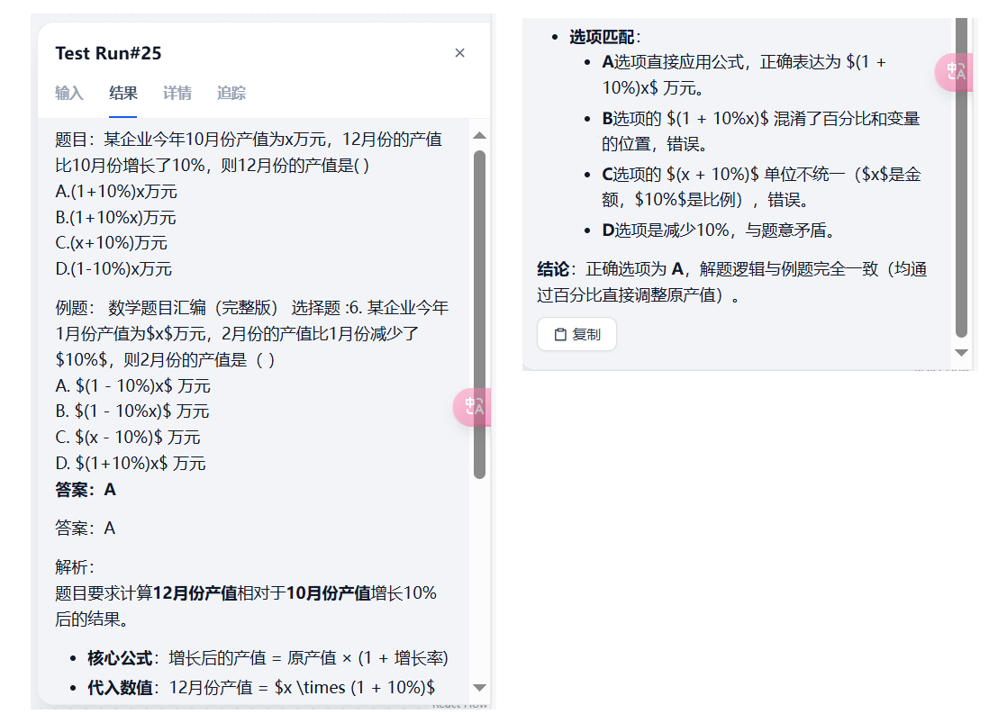 它的效果就是,当我们问到题库中类似的题目时,由于题库的题目是有题干、也有答案的,因此相当于给了大模型一个例题,大模型可以根据例题来解决新的问题,从而提升问题解答的准确率。
