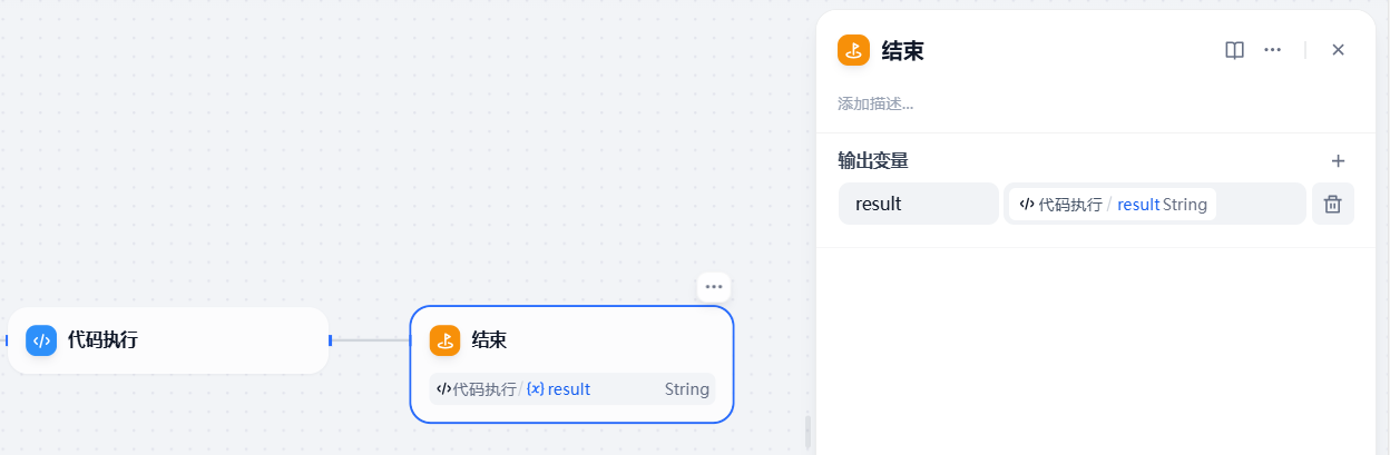 这一步完成后,加一个结束节点,将代码解释器的 result 输出即可。