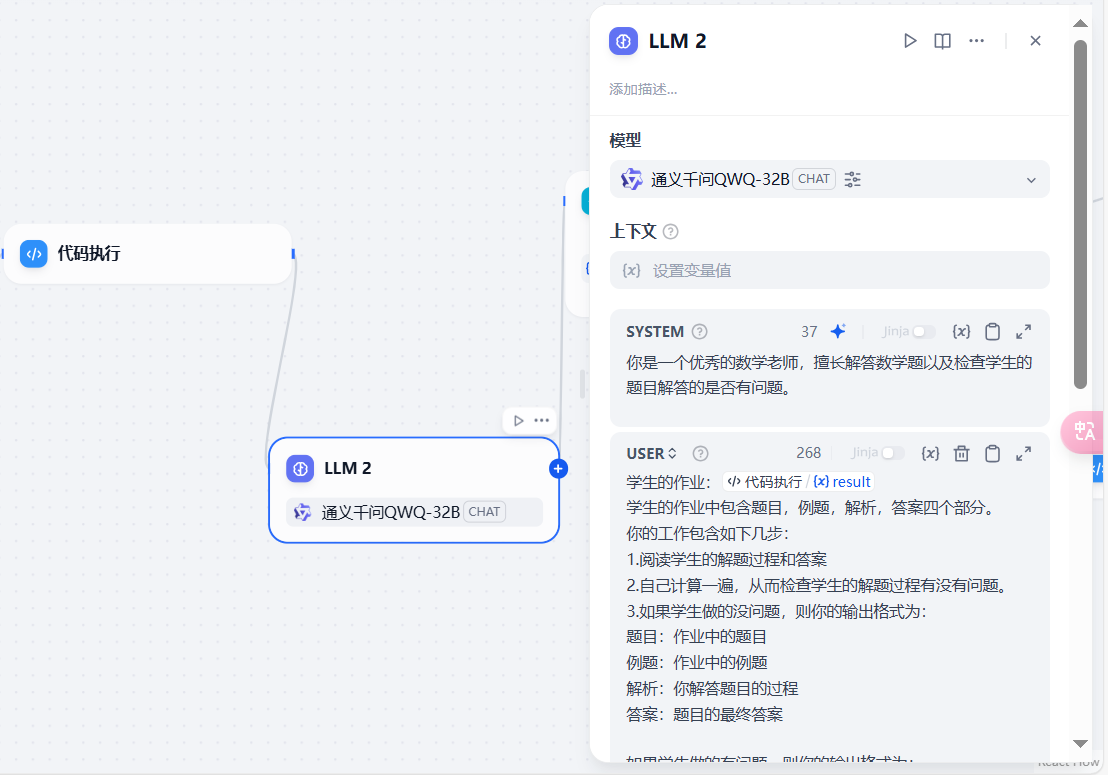 我这样做的目的是,当 LLM2 认为前面的节点算对了的时候,就直接将内容输出,结束就可以了。但如果算错了,就可以将 LLM2 结果返回的同时,将结果再通过飞书或者其他方式通知给人类,让人类判断一下是否要人工看看答案算对了没。当然这一步不通知也无所谓,毕竟我们还是要相信第二个模型的纠错能力。