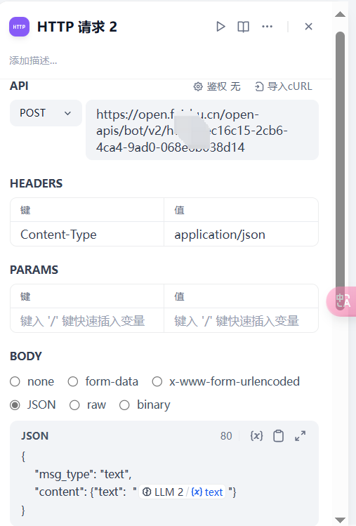 在 Body 中,我们设置为 JSON 格式,然后将 LLM 的输出 text 作为 message 的入参。