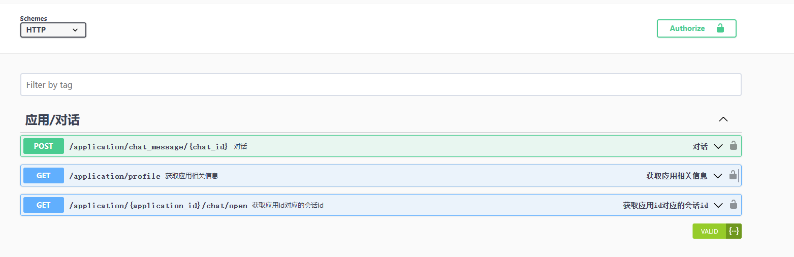 会话 id 要通过前两条的调用来获取,我们直接在 Swagger 文档中调用即可。调用前先点一下 API 后面的那个开着的小锁,设置一下 API Key。