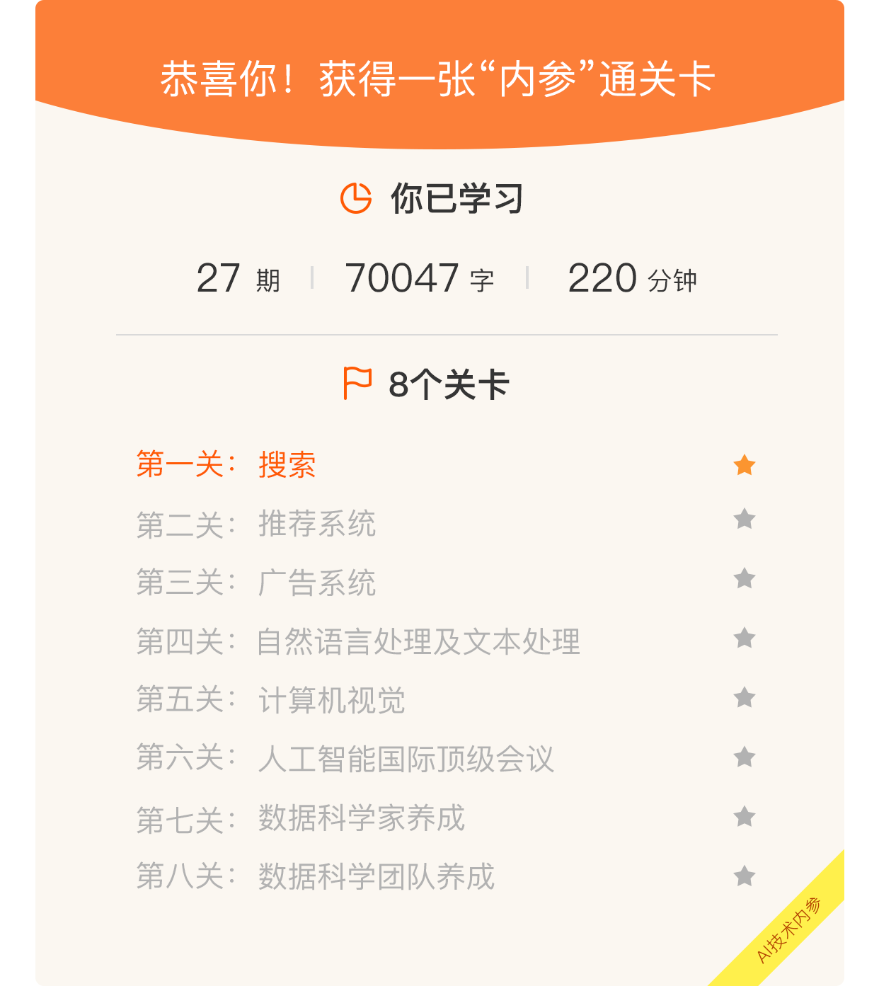 到目前为止,我们讲完了人工智能核心技术的第一个模块——搜索。我们从搜索的核心算法入手,进而讨论了搜索的两个关键组件,分别是查询关键字理解和文档理解,并落实到对搜索系统的评价,然后从宏观视角介绍了搜索框架的历史和发展,最后又从深度学习技术在搜索领域的应用角度,对分享做了一个延伸。