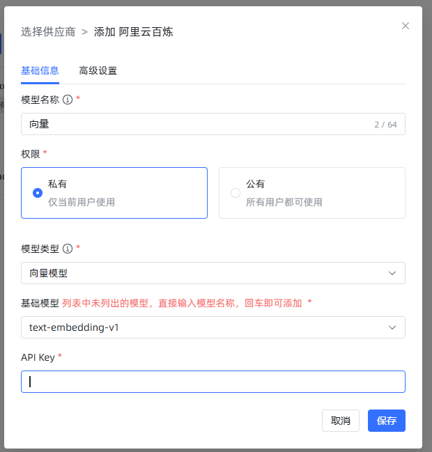 这里的向量模型,我用了阿里云百炼的 text-embedding-v1。