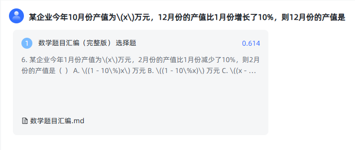 接下来就是将文档导入到知识库了,我准备的是一份中学数学题试卷。不过在导入之前,我们需要对文档的格式、内容排版等做手工调整,这样才能增加向量搜索时的命中率,这个步骤称之为数据清洗。