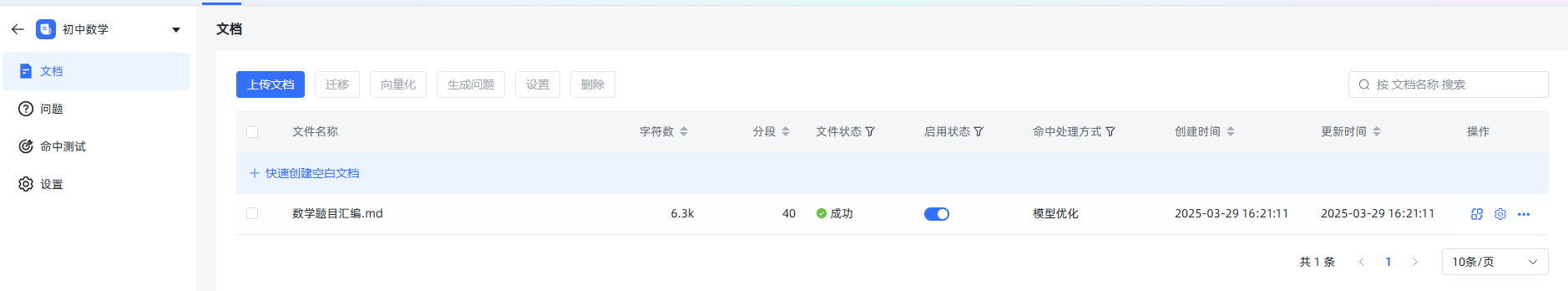 文档向量化后,我们可以通过左侧的命中测试,调节不同的参数,来测试文档搜索的效果。
