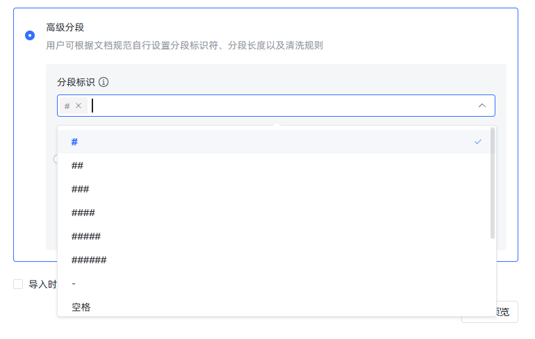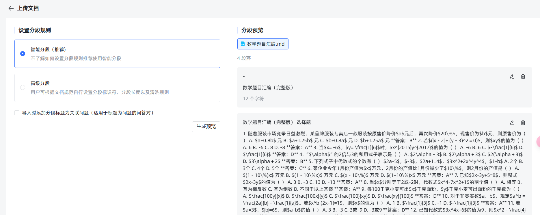 然后我们再次导入,选择高级分段,分段表示选择“#”“##”。空行表示按 MardDown 的一级、二级标题和空行分段,把分段长度调整成 800,防止 35 题之后的那些计算题由于太长而被拆分了。再次生成预览,可以看到这次效果达标了。