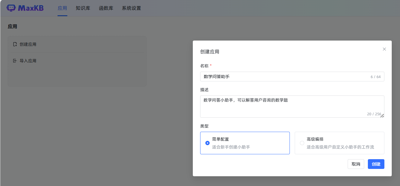 想要把MaxKB 的知识库问答助手功能用起来,需要创建应用。