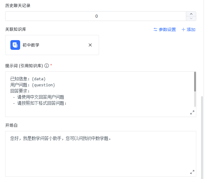 点击创建后,就会进入到设置和调试页面。我们可以设置问答所使用的大语言模型以及管理知识库。此外还需要设置引用知识库后的系统提示词。
