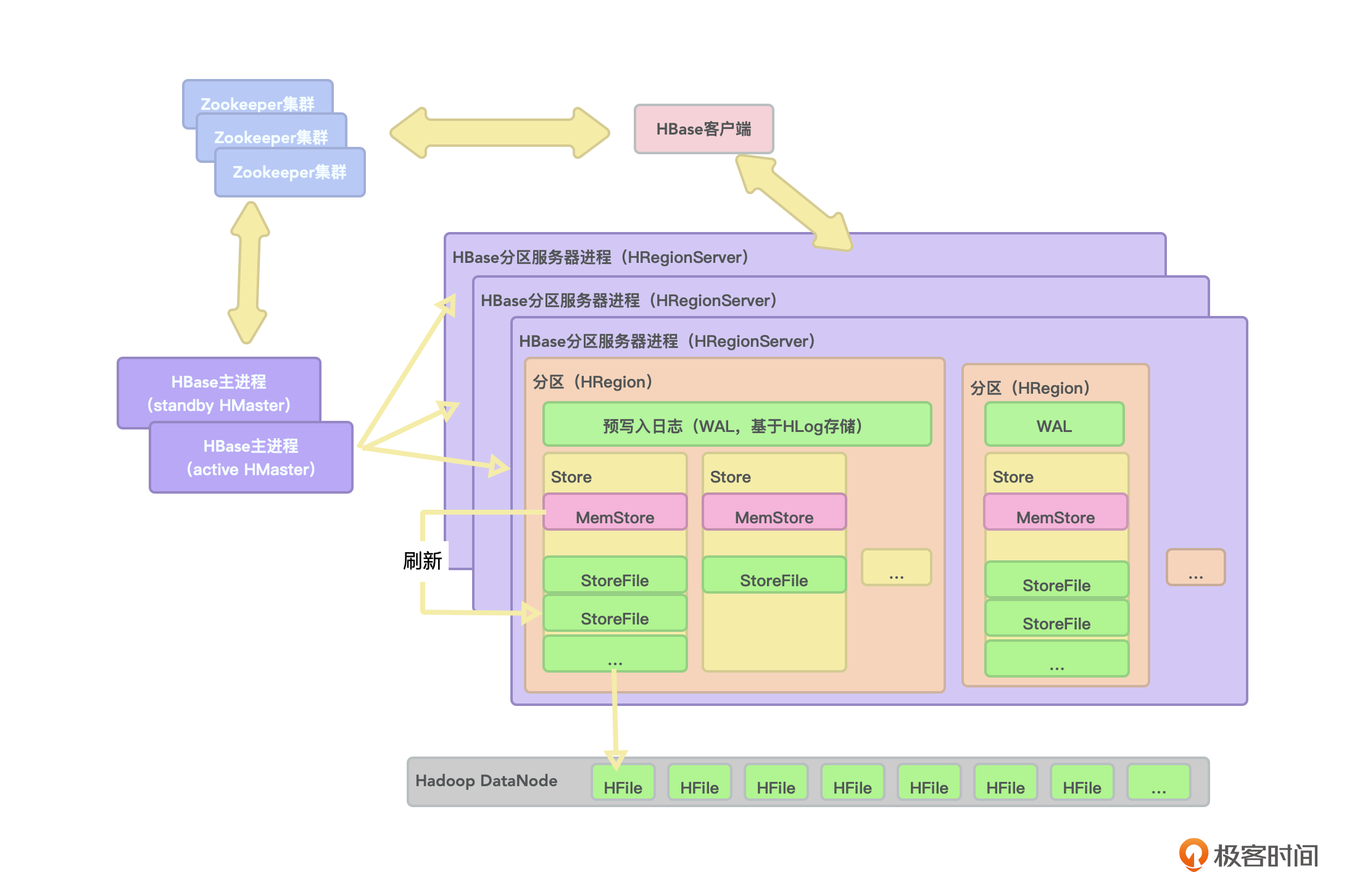 再来看一下集群的“管家” Master。你可以看到,图中有active和standBy两个HMaster进程,实际上,一个HBase集群可以有多个Master来竞争成为active的Master。只要active的Master宕机了,或者在Zookeeper上的租期过期了,其他standBy的Master就会竞争成为新的active Master,实现高可用,确保集群正常运行。