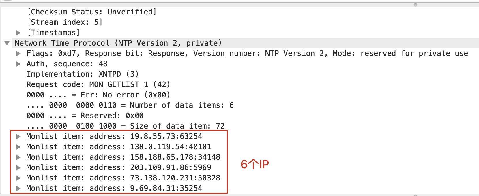 响应包按照每6个IP进行分割,最多有100个响应包。这样的话,一个简单的NTP Monlist响应,就可能是请求的200多倍。想象一下,如果请求是1Gbps,那这次反射攻击就可以达到200Gbps以上,实在惊人!