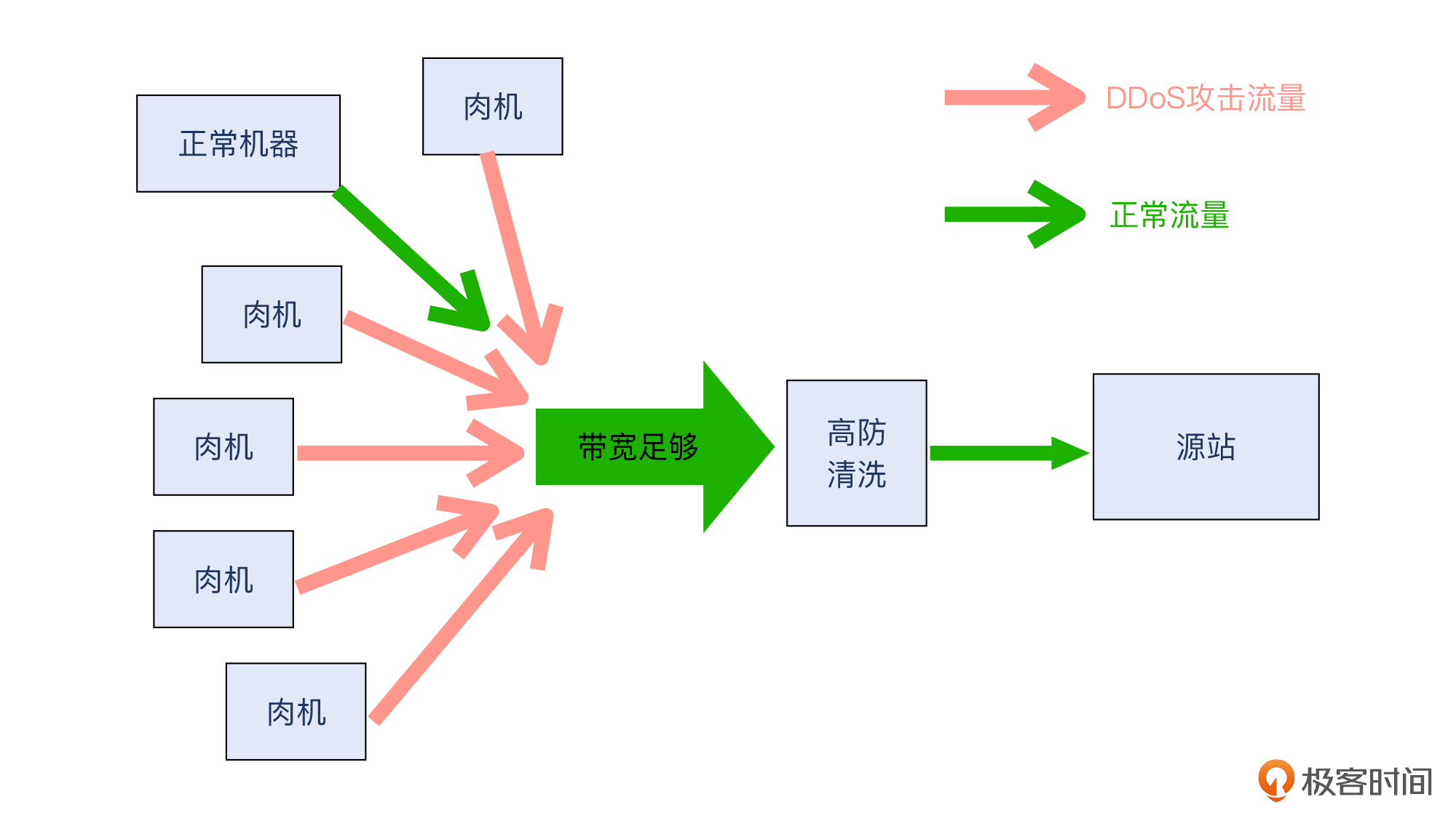 - 在接纳后进行清洗,把正常流量识别出来,发回给源站,让业务继续进行。