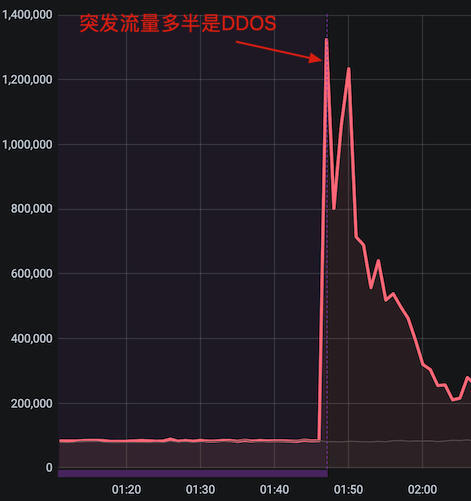 我们也系统性地分析了DDoS的核心方法,也就是用“耗尽网络带宽”的方式,让被攻击站点无法正常提供服务。在排查方面,当我们发现服务异常时,在服务端做抓包分析,可以快速定位是否有DDoS攻击。也可以直接根据带宽使用图,关注到突发的巨型流量时也可以直接判定是DDoS攻击。