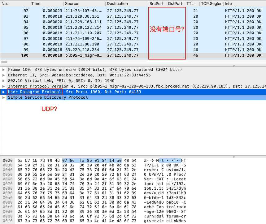 但更奇怪的问题来了:这里的HTTP竟然用了UDP作为传输协议?HTTP一般是用TCP协议的,那这里用UDP又是怎么回事呢?是不是感觉网络协议到处都可能有意想不到的情况?