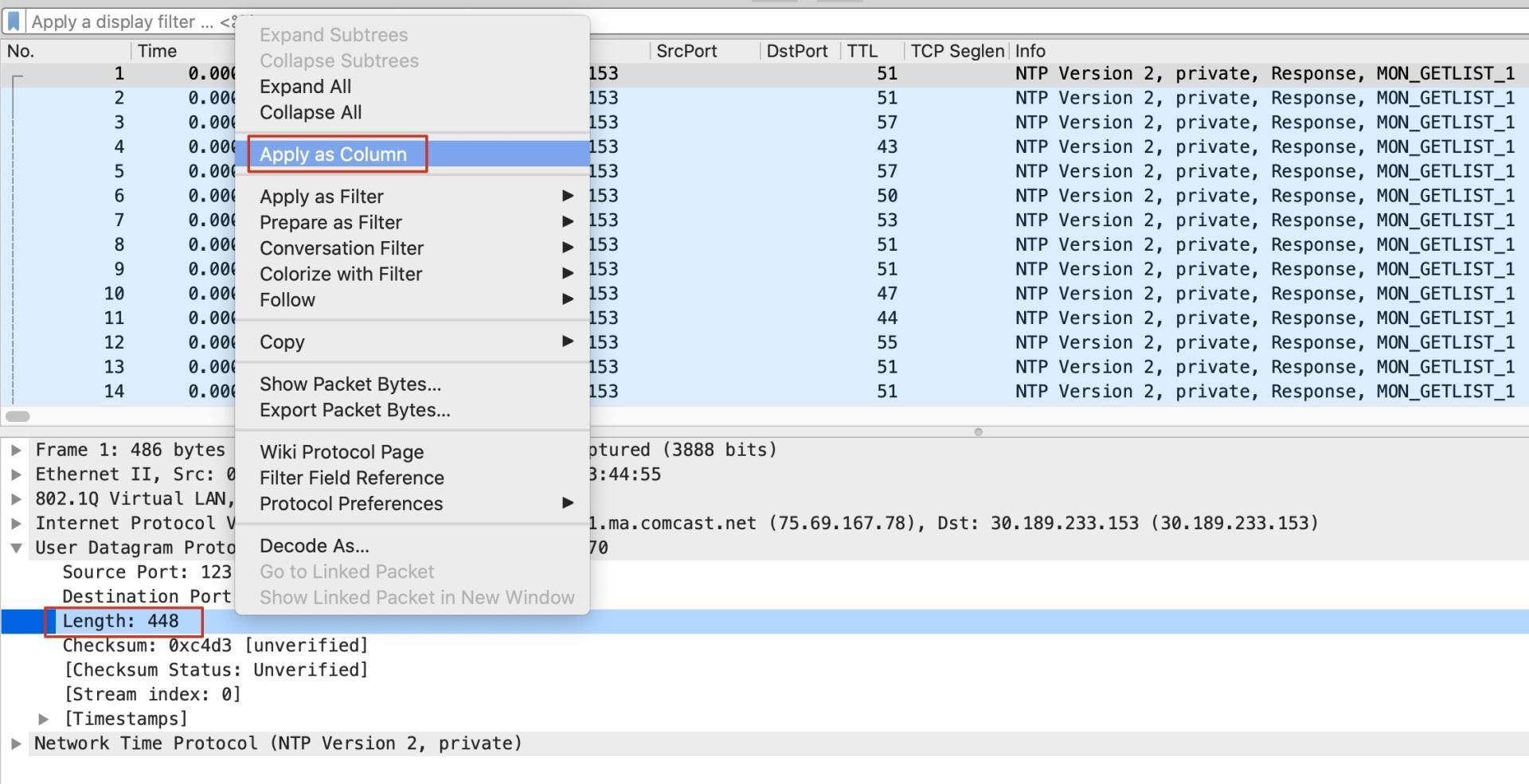 不过,现在Wireshark窗口里解读UDP报文长度不是很直观,这是因为Wireshark默认没有显示UDP长度的列,但我们可以自己添加。在UDP详情里选中Length,然后右单击,选中Aplly as Column: