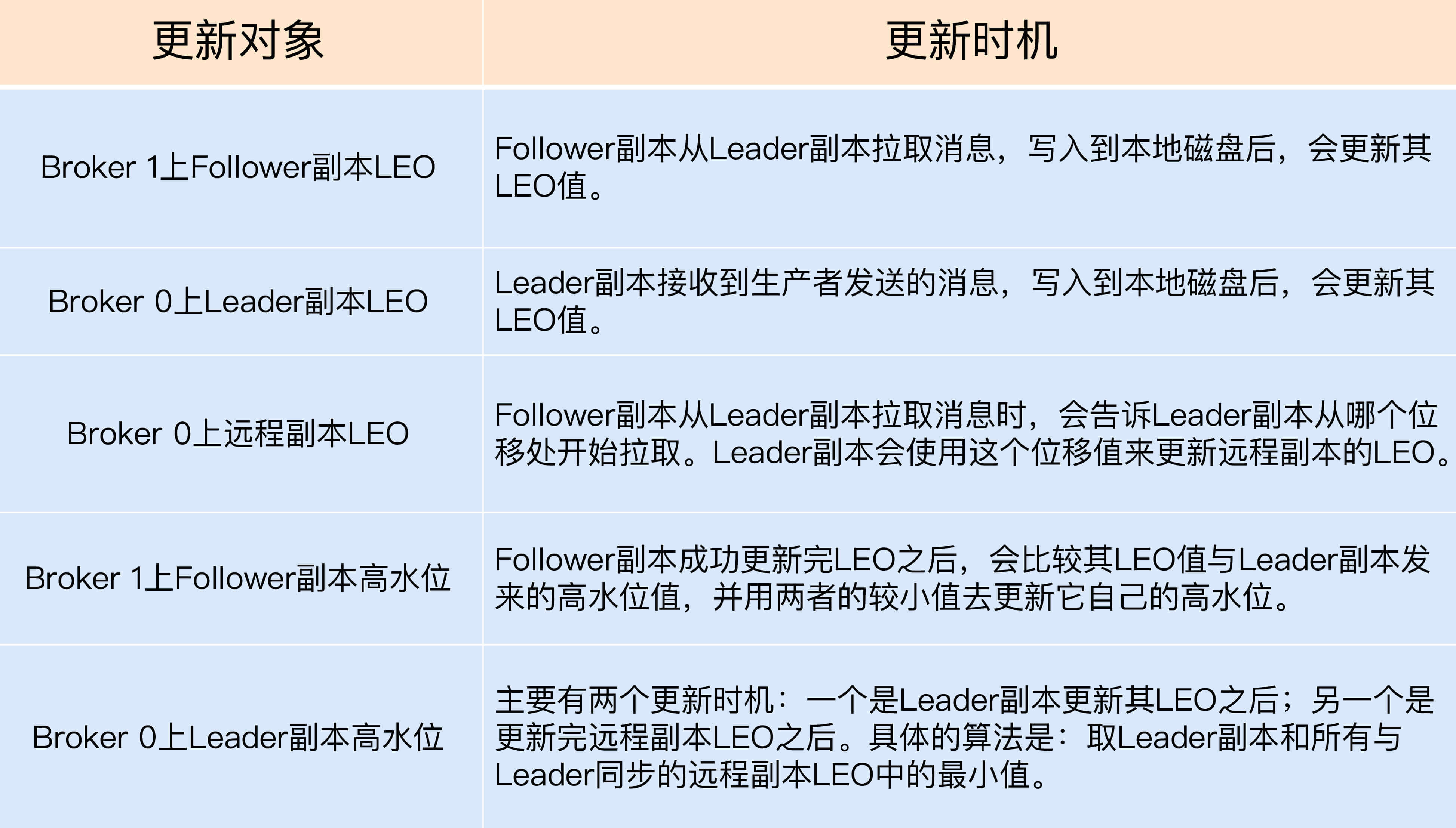 为了帮助你更好地记忆这些值被更新的时机,我做了一张表格。只有搞清楚了更新机制,我们才能开始讨论Kafka副本机制的原理,以及它是如何使用高水位来执行副本消息同步的。