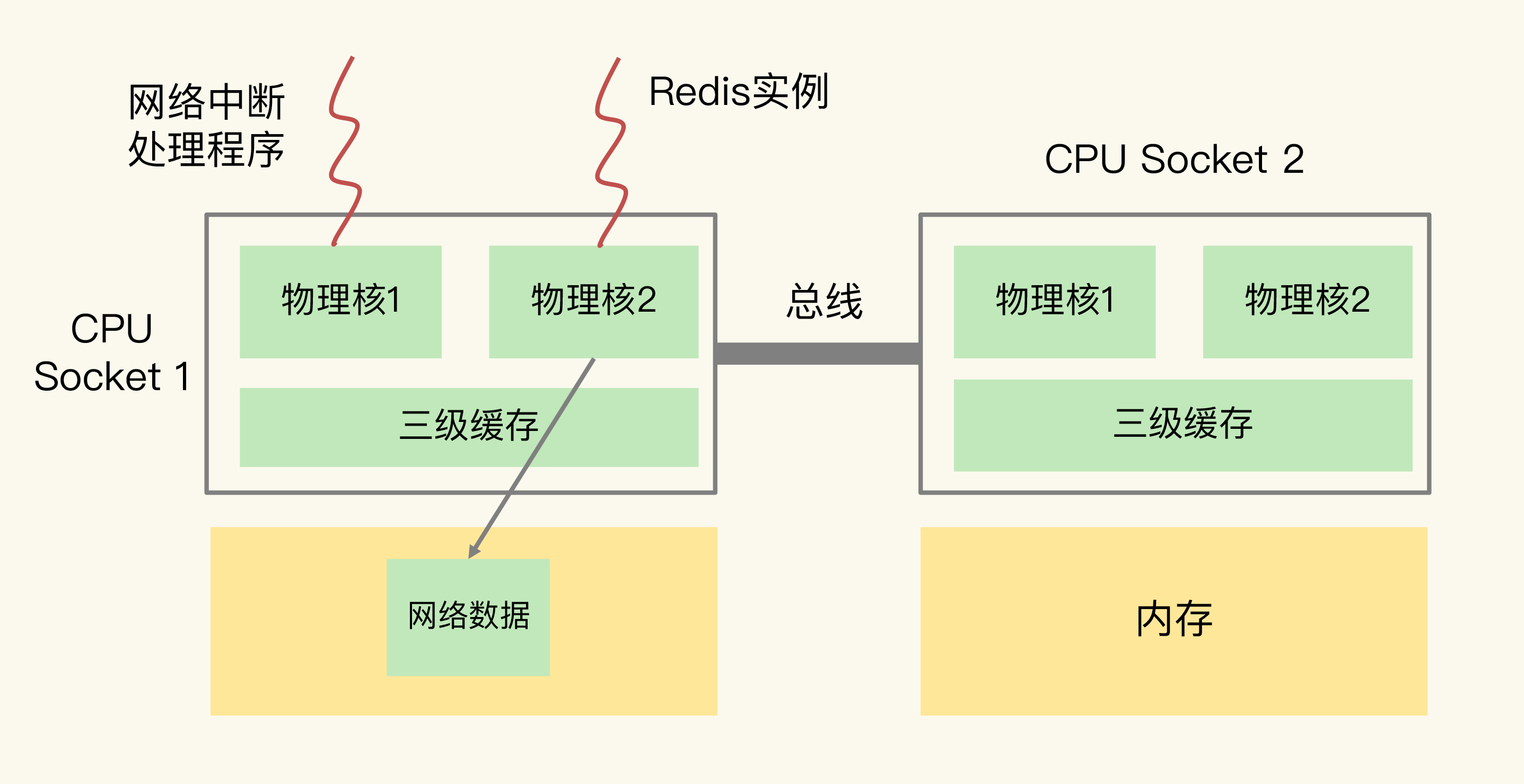 可以看到,图中的网络中断处理程序被绑在了CPU Socket 1的某个核上,而Redis实例则被绑在了CPU Socket 2上。此时,网络中断处理程序读取到的网络数据,被保存在CPU Socket 1的本地内存中,当Redis实例要访问网络数据时,就需要Socket 2通过总线把内存访问命令发送到 Socket 1上,进行远程访问,时间开销比较大。