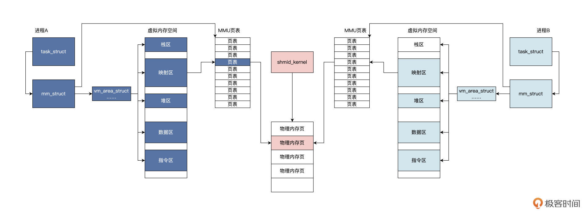 Linux内核提供了两种共享内存的实现,一种是基于物理内存映射,另一种是基于mmap文件映射,这个mmap函数我们在前面的课程中多次见过了,你可以回顾之前的课程。