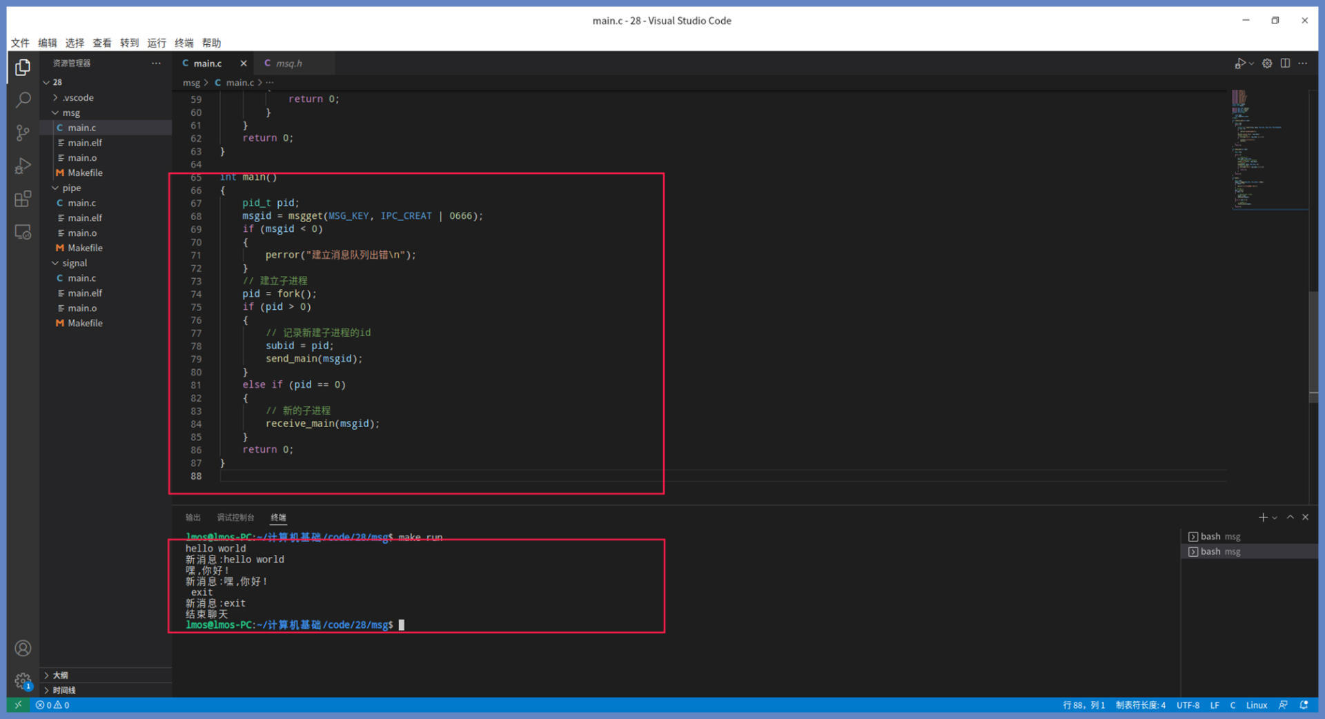 对照代码可以看到,发送代码的就是send_main函数,这个函数由主进程调用,它会在一个循环中设置消息类型后,获取用户输入的消息内容并放入msg消息结构体中。然后,调用msgsnd函数向mid标识的消息队列发送消息,消息来自于msg结构体变量,指定MSG_SIZE为消息大小,并且以同步方式发送消息。