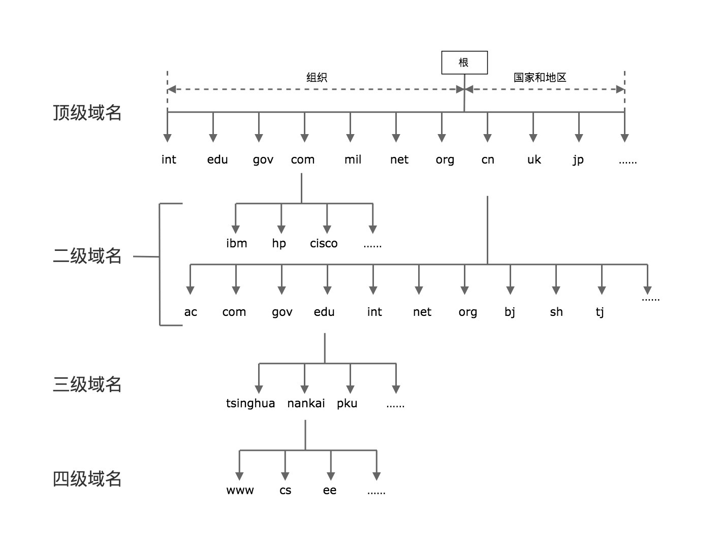 全球域名按照从大到小的结构,形成了一棵树状结构。实际访问一个域名时,是从最底层开始写起,例如 www.google.com,www.tinghua.edu.cn等。