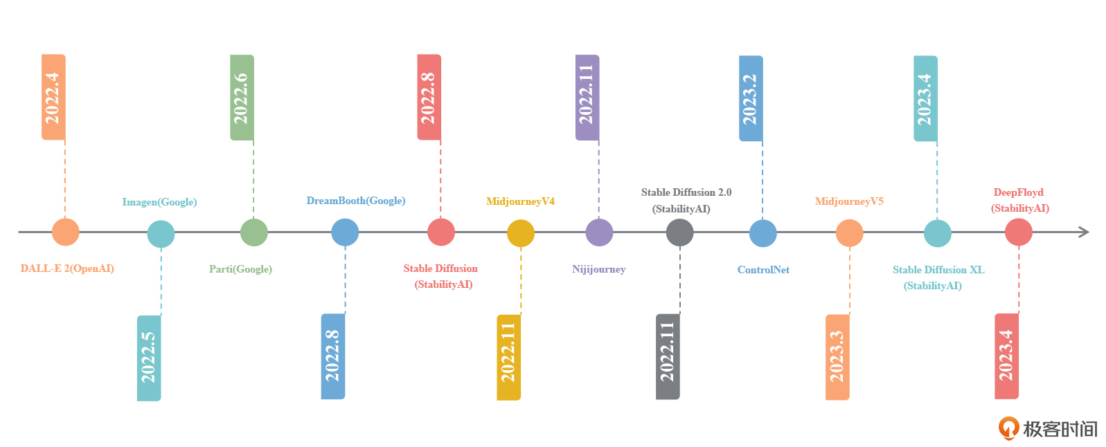 在下面的图中,我整理了从DALL-E 2推出以来,AI绘画领域一些有影响力的模型和算法。你可以点开查看。